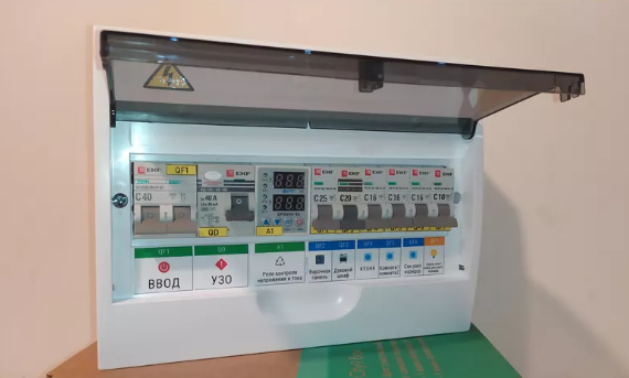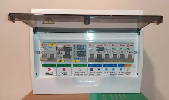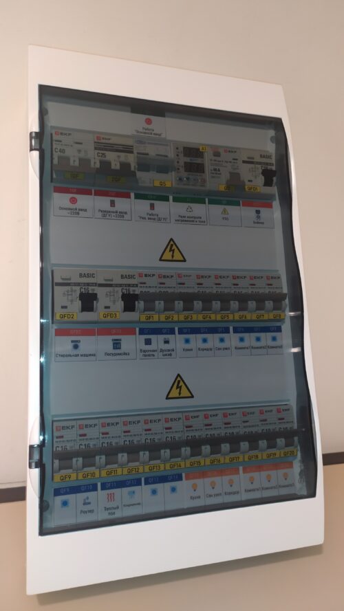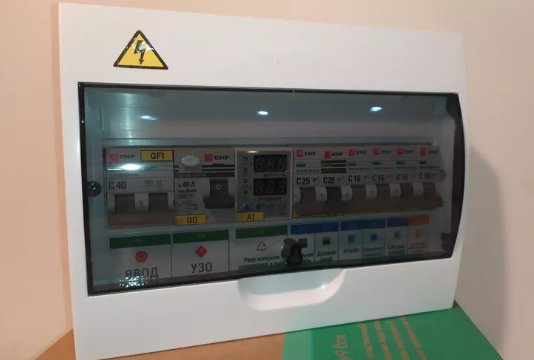 Щит изготовлен из негорючего пластика, имеет тонированную дверцу дымчатого оттенка. На вводе имеется УЗО для защиты при утечке на землю. Установленное оборудование имеет действующий сертификат соответствия.