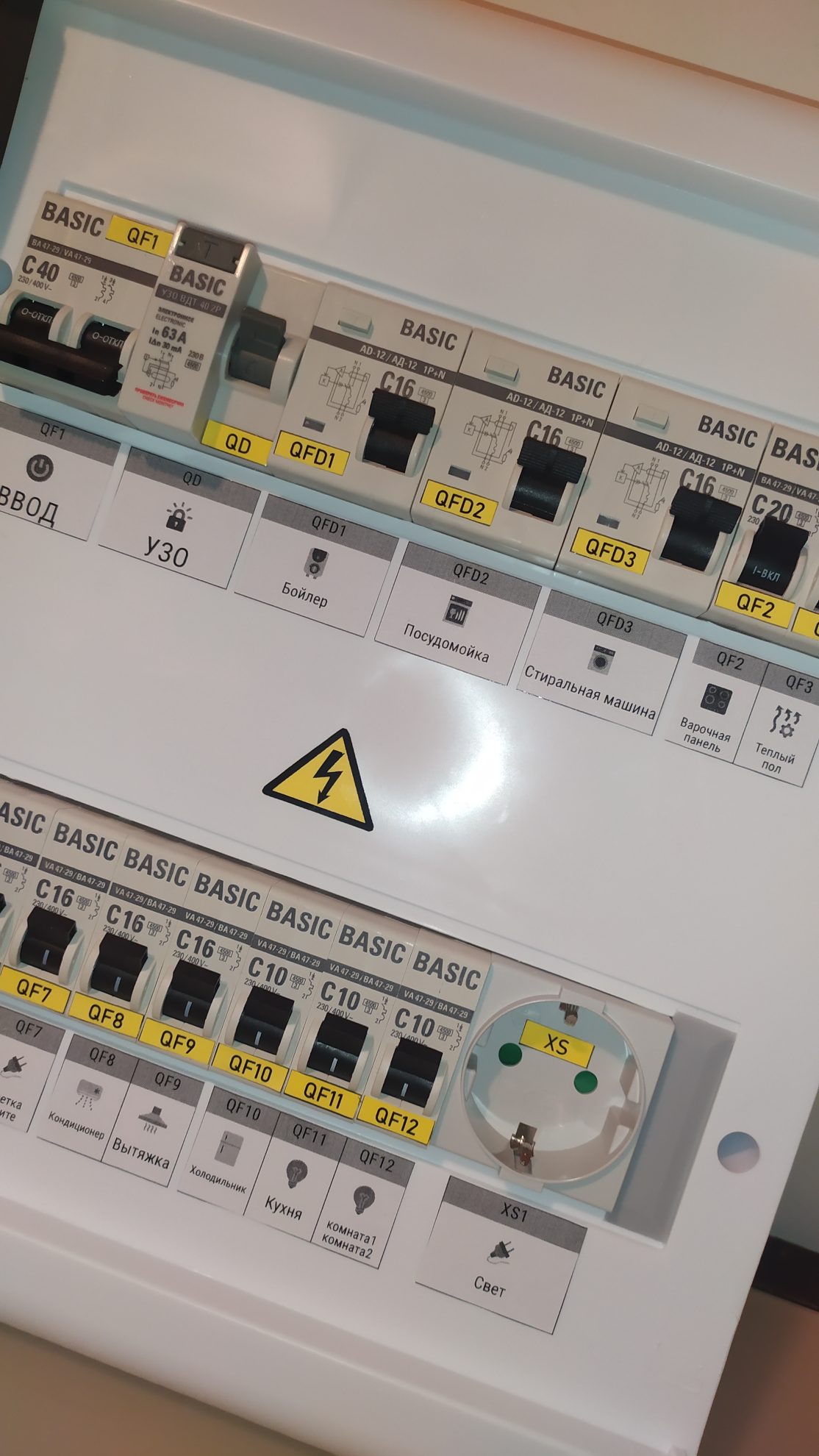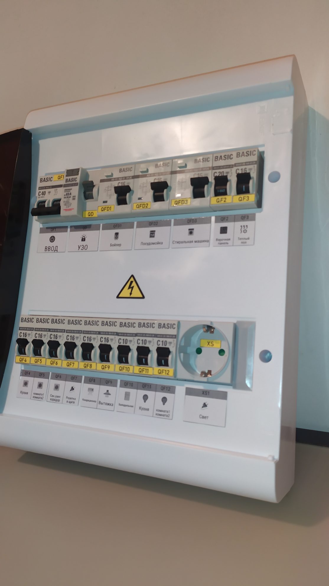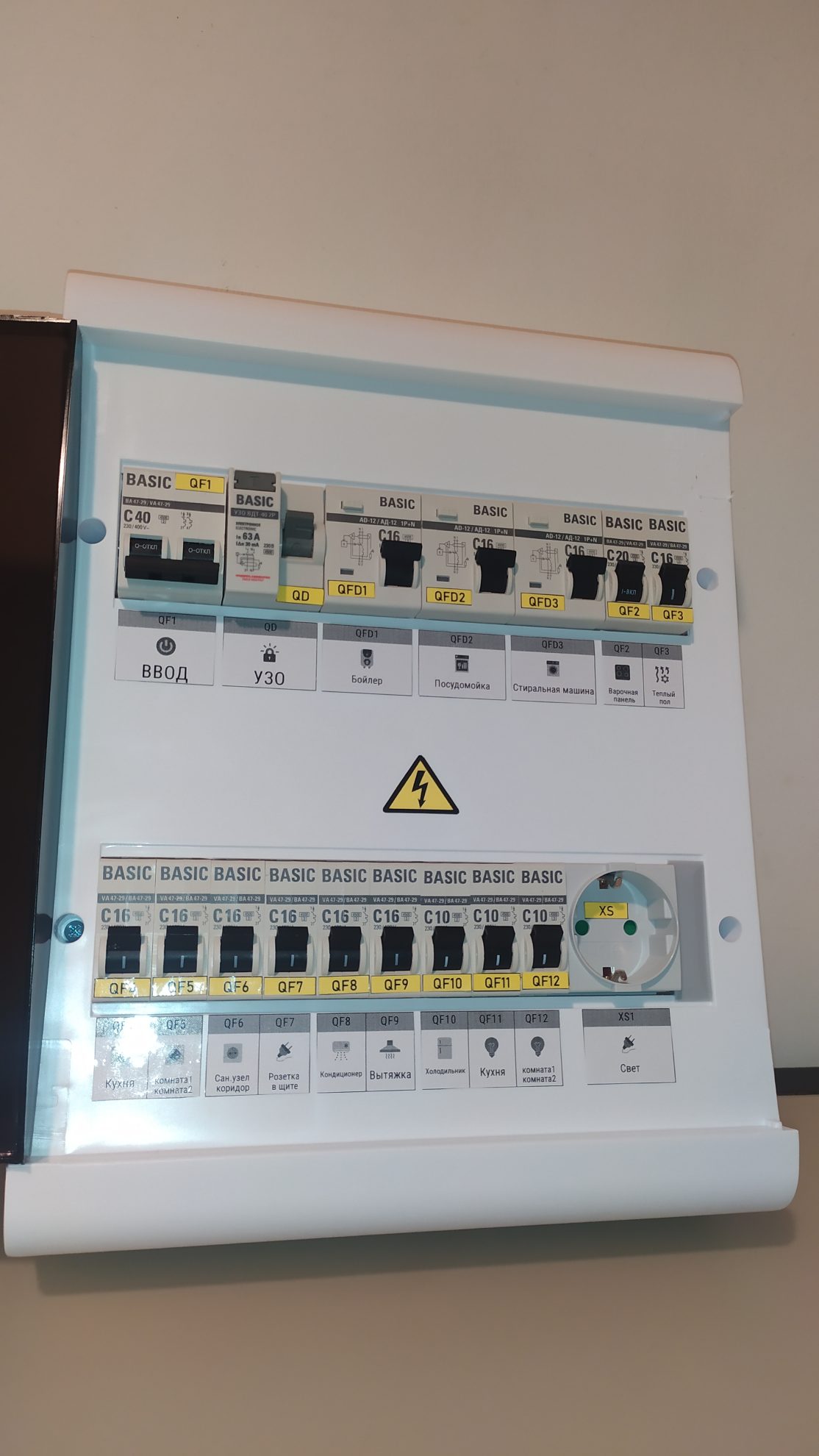 Готовый к установке электрощит на 24 модулей, 220В 2П 40А. Предназначен для квартиры, дачи или частного дома. Установка на стену. Полностью готов для подключения потребителей. На вводе имеется УЗО для контроля и отключения при утечке на землю.