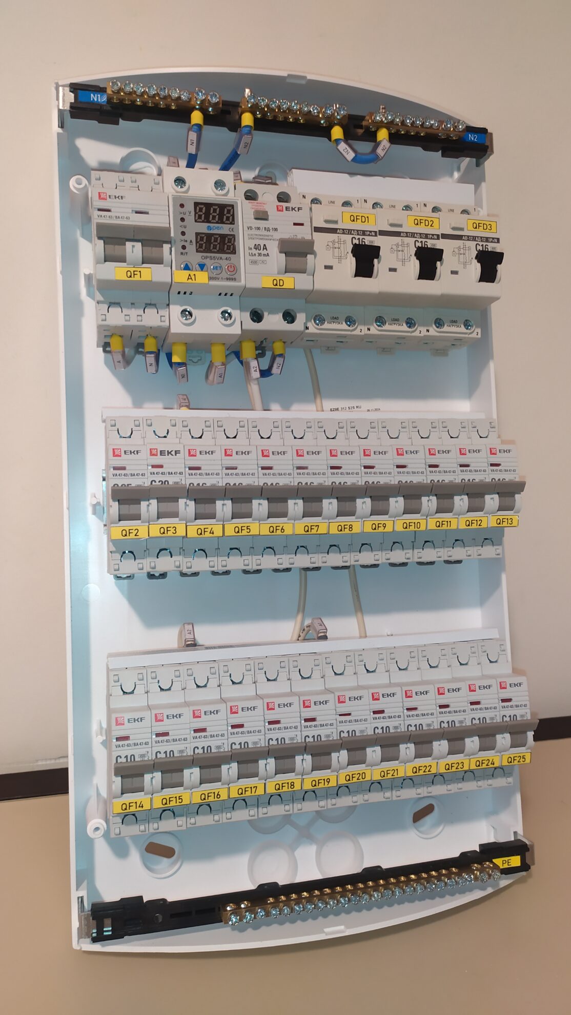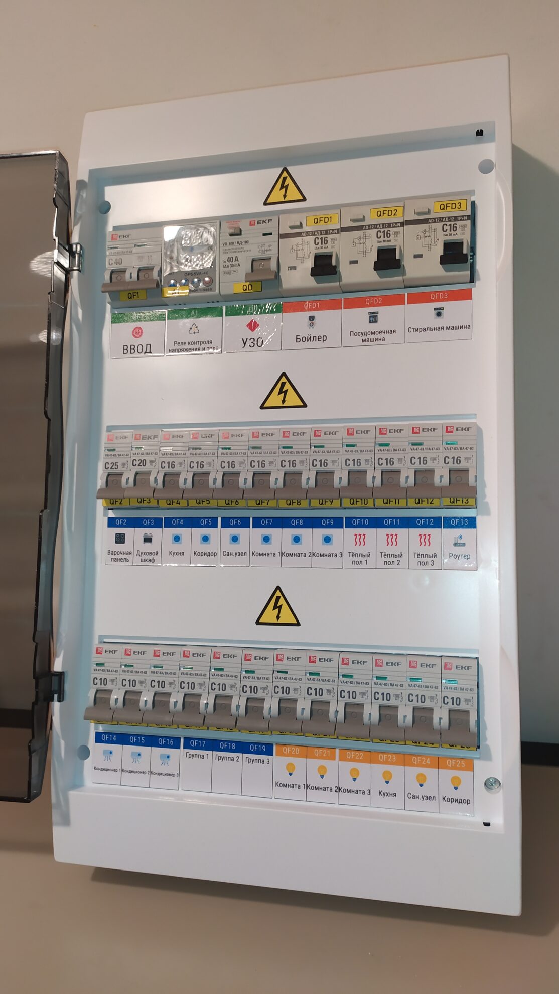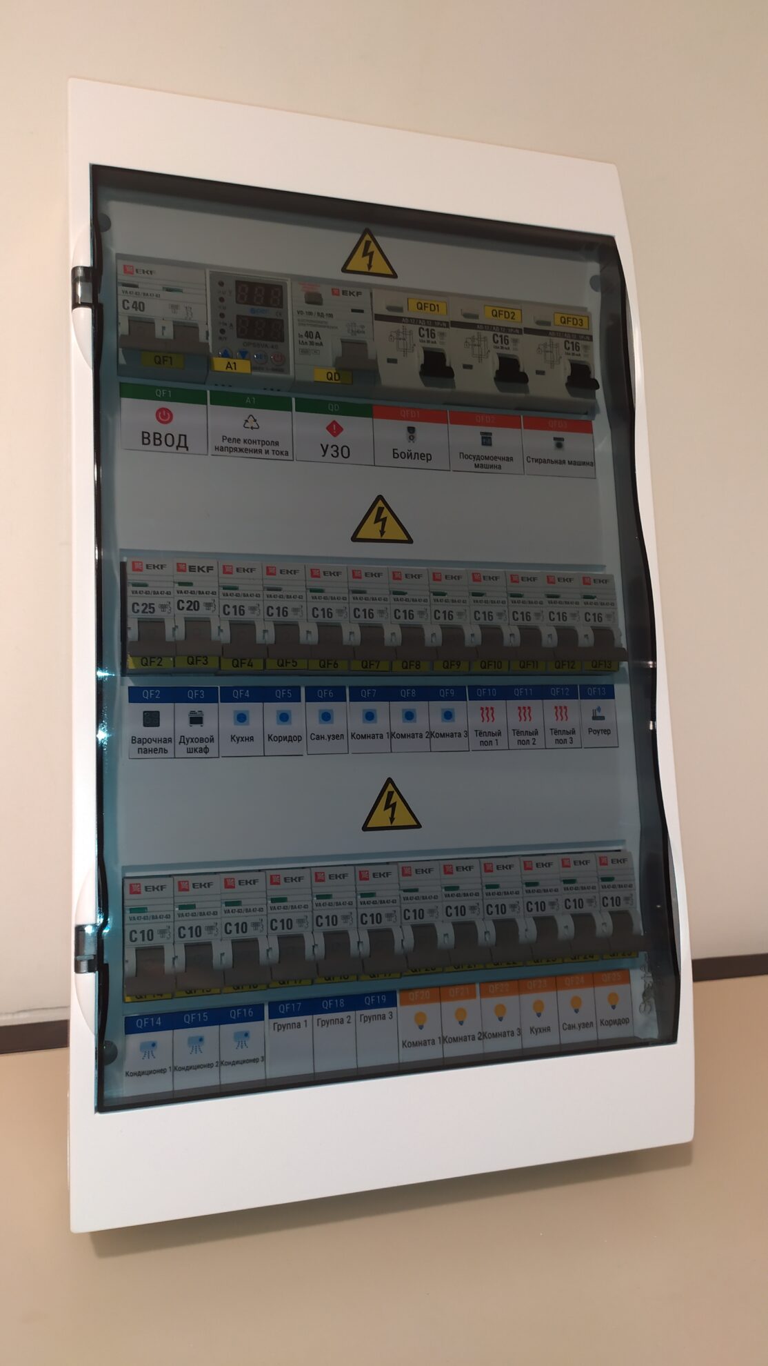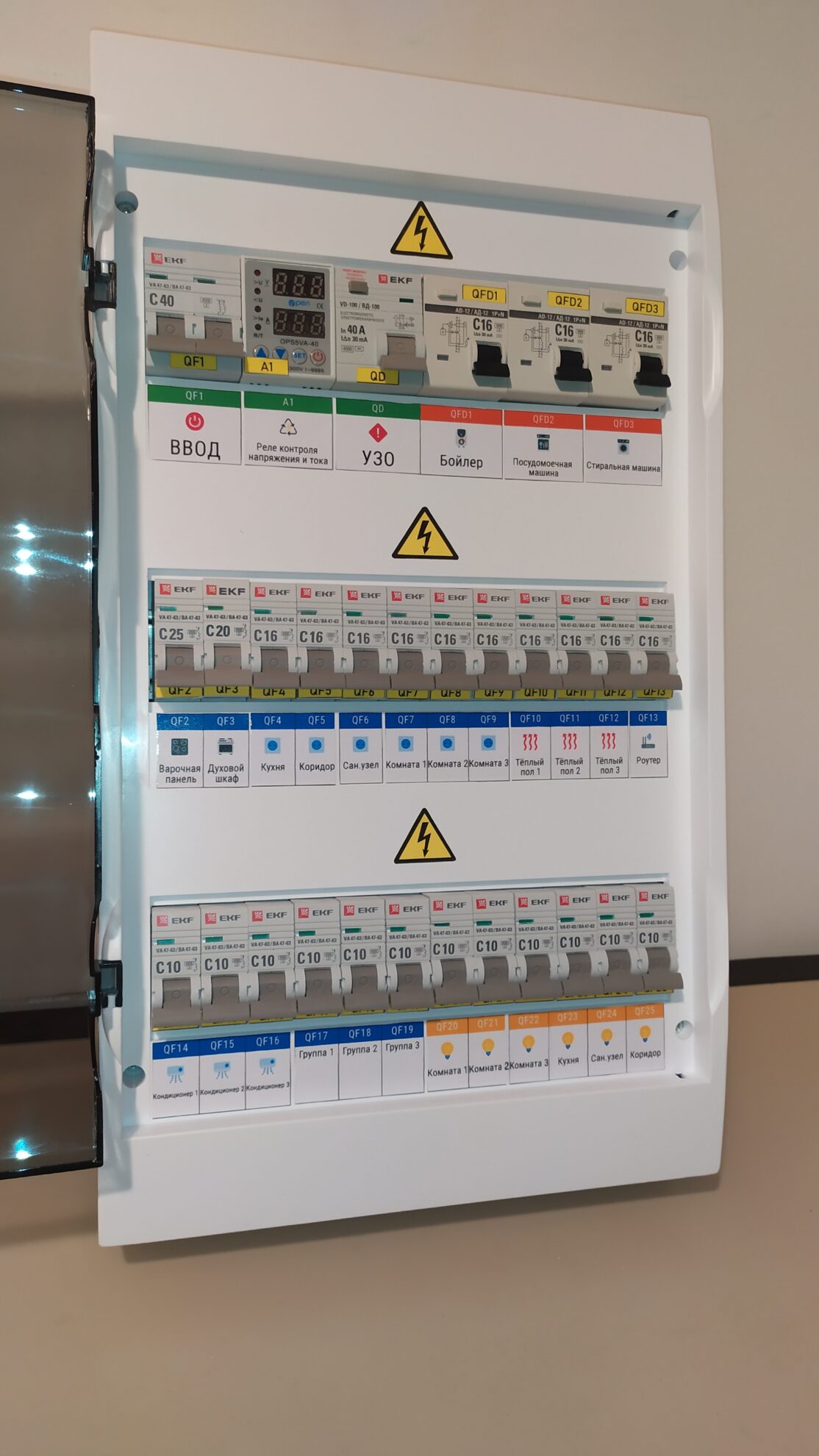 На вводе установлено УЗО для контроля и отключения при утечке на землю. Также в щите установлено реле контроля напряжения и тока: для удобства контроля состояния ситуации при аварийных случаях. Стандартные параметры реле предустановлены.