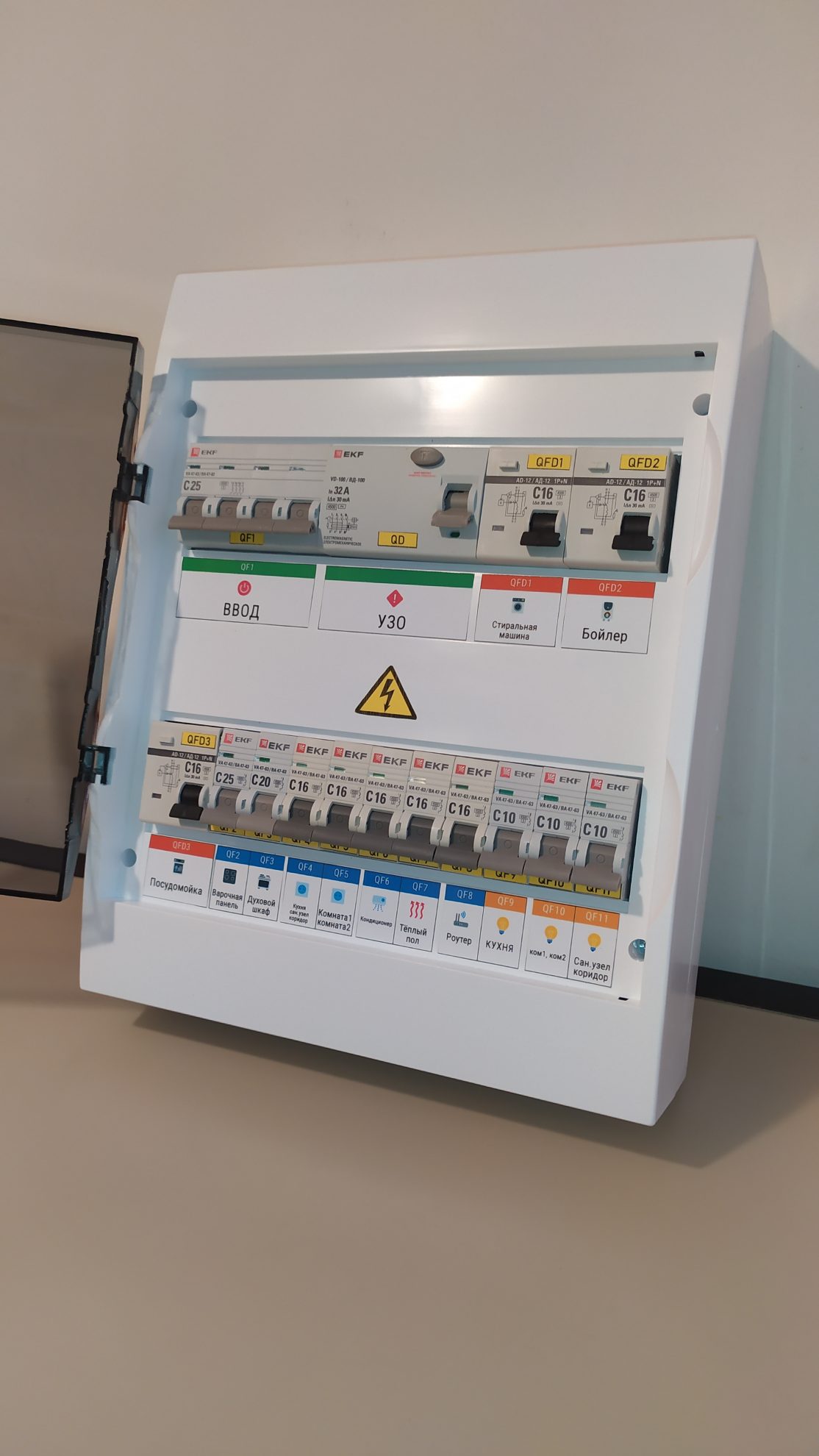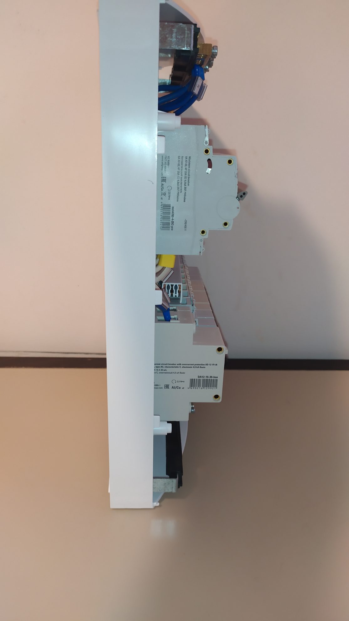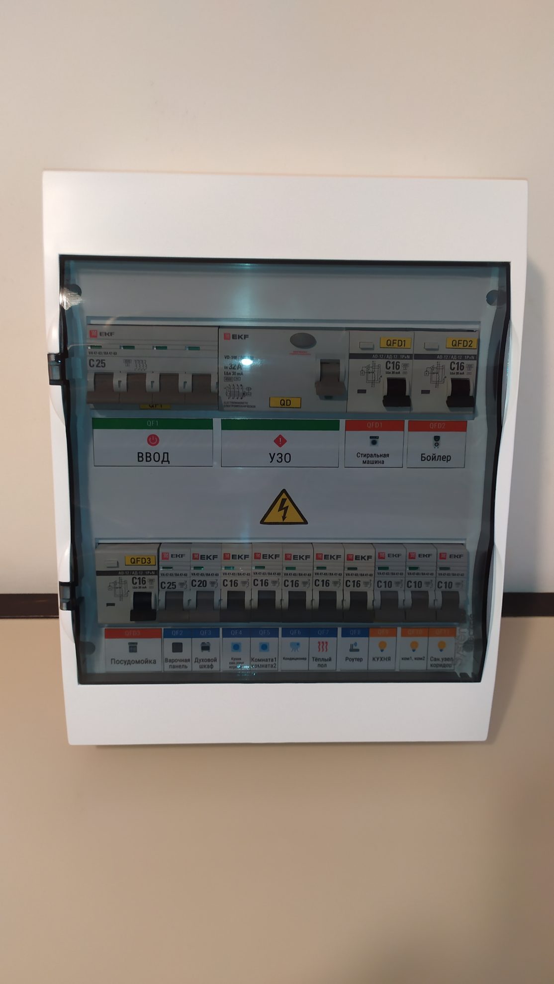 Щит изготовлен из негорючего пластика, имеет тонированную дверцу дымчатого оттенка. На вводе имеется УЗО для защиты при утечке на землю. Установленное оборудование имеет действующий сертификат соответствия.