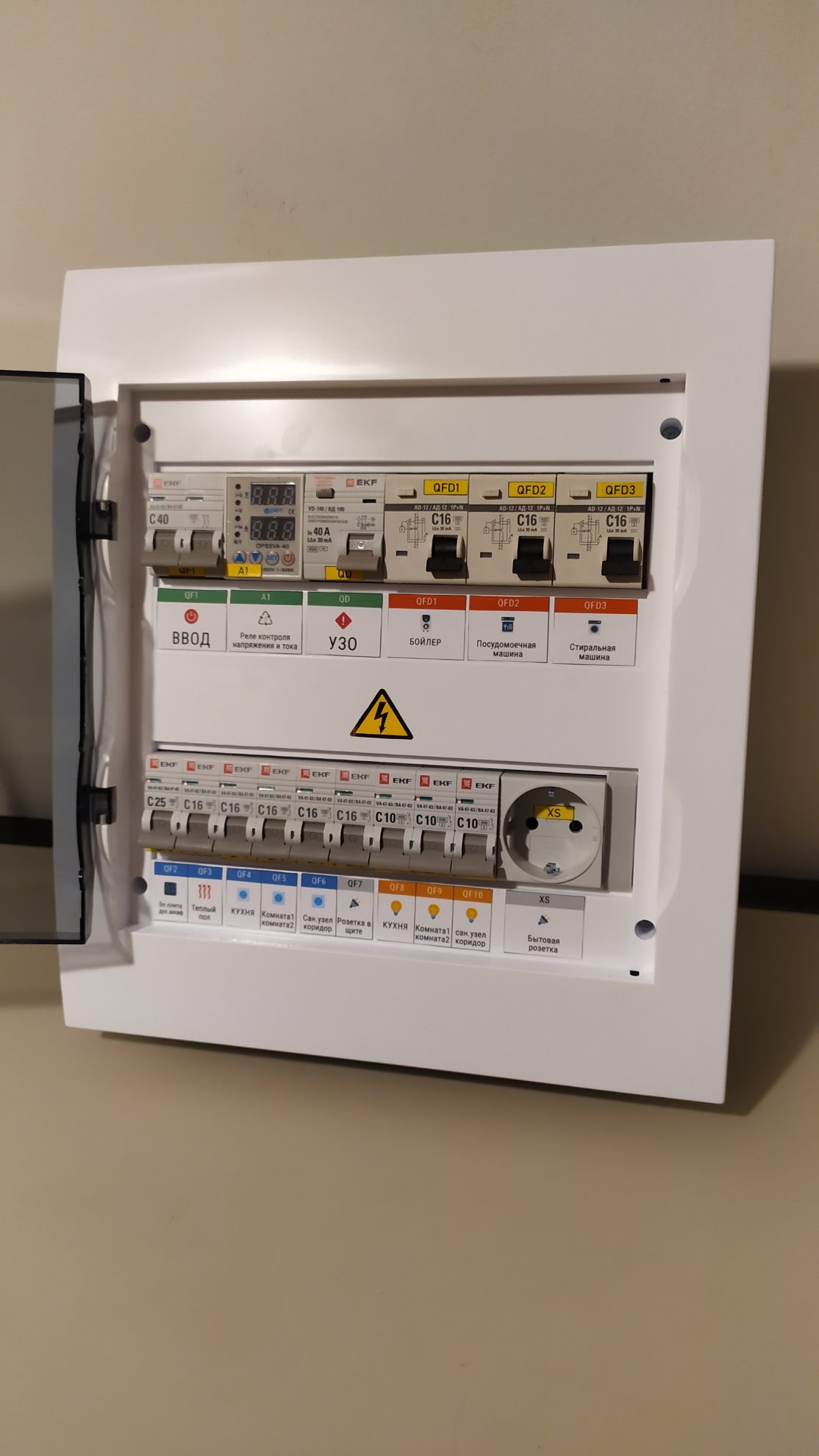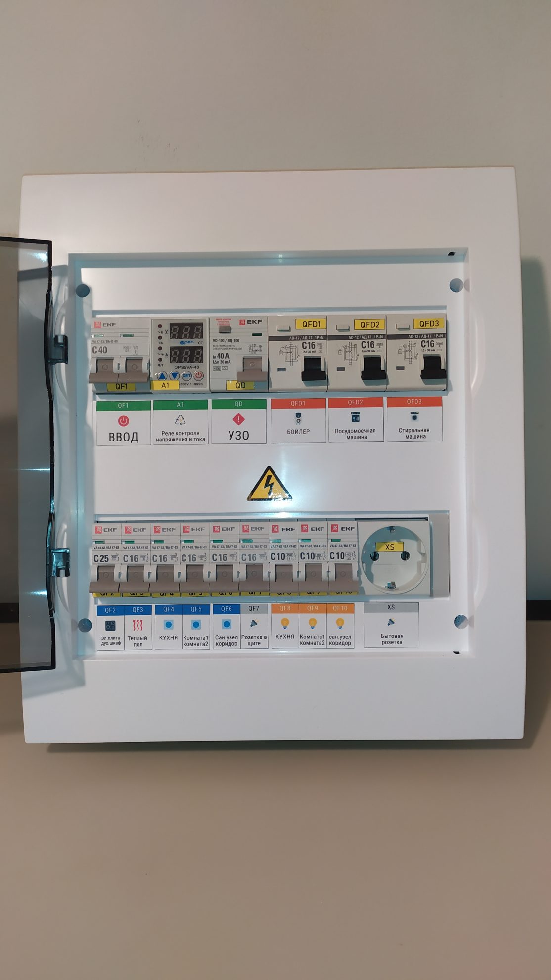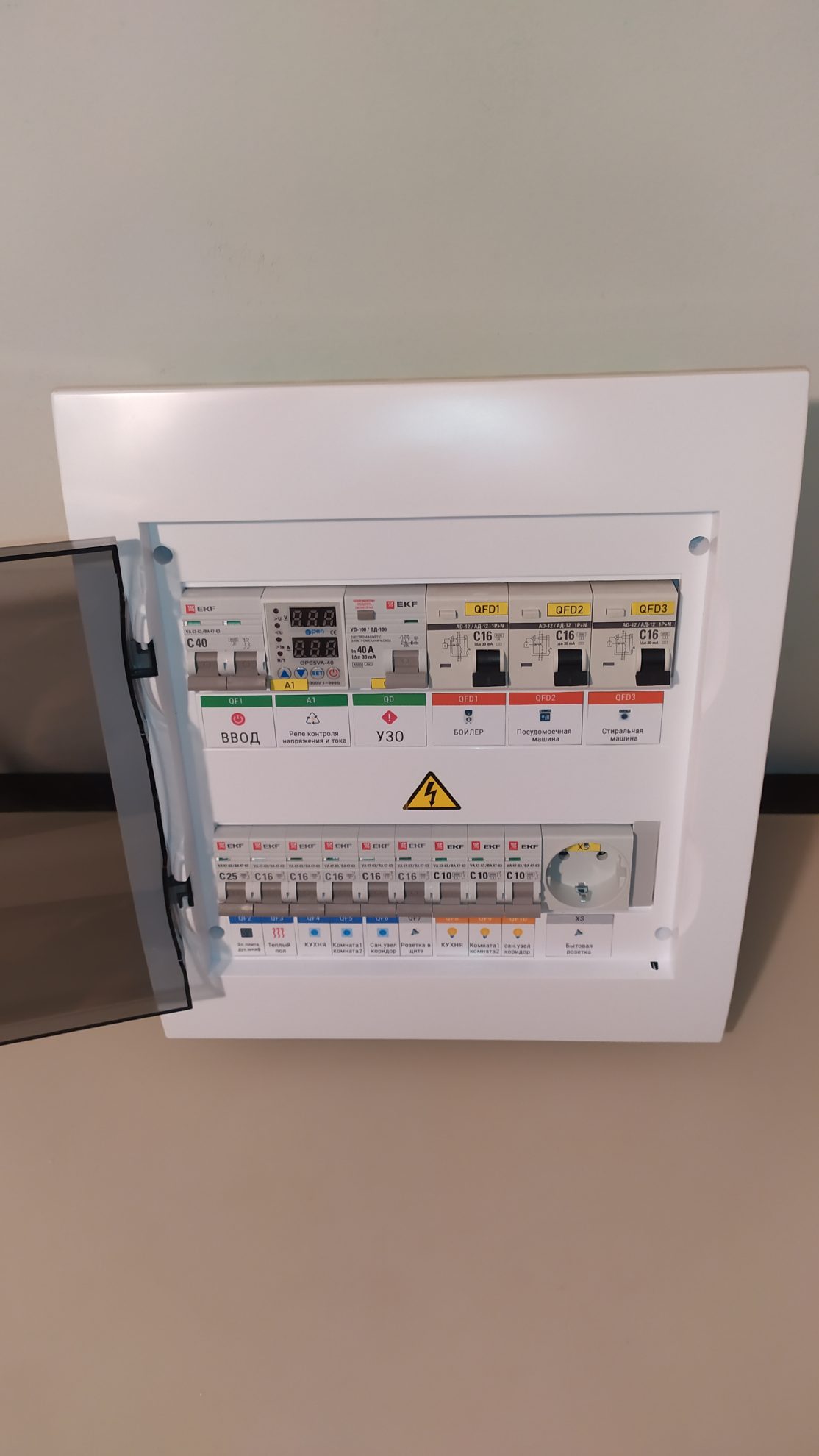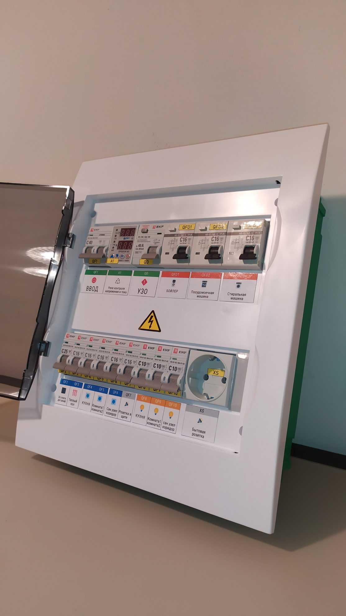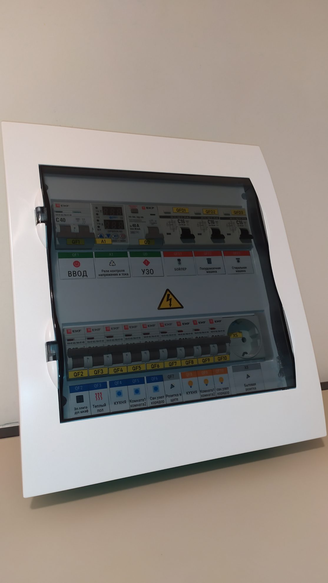 Готовый к установке электрощит на 24 модуля, 220/220В 2П 40А. Предназначен для квартиры или дачи. Установка в подготовленную нишу. Полностью готов для подключения потребителей. На вводе имеется УЗО для контроля и отключения при утечке на землю. Также установлено реле контроля напряжения и тока, что предотвращает от внезапного выхода из строя потребителей, подключенных к щиту.