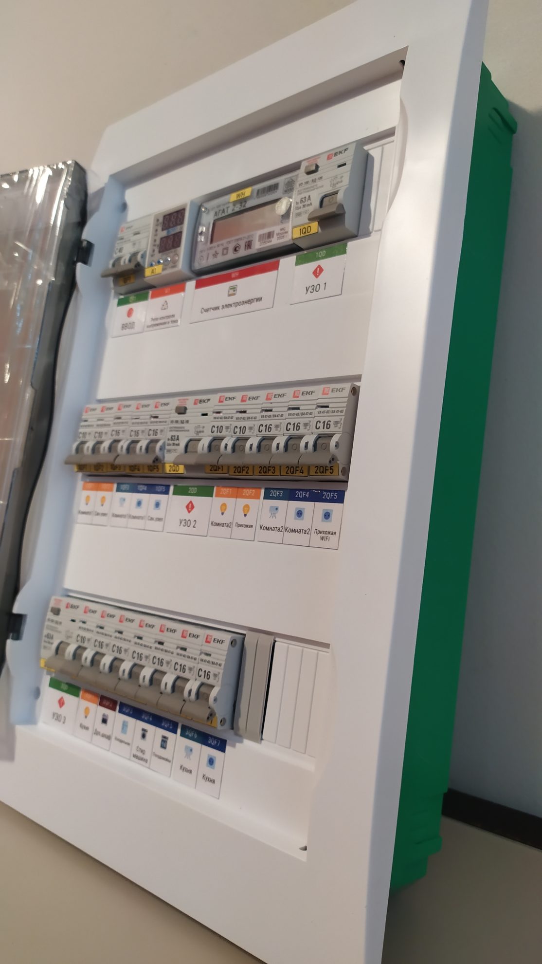 Готовый к установке электрощит встраиваемый в нишу на 36 модулей, 230В, на мощность не более 8,8 кВт с учётом электроэнергии. Предназначен для квартиры или дачи. Установка в подготовленную нишу. Полностью готов для подключения потребителей.